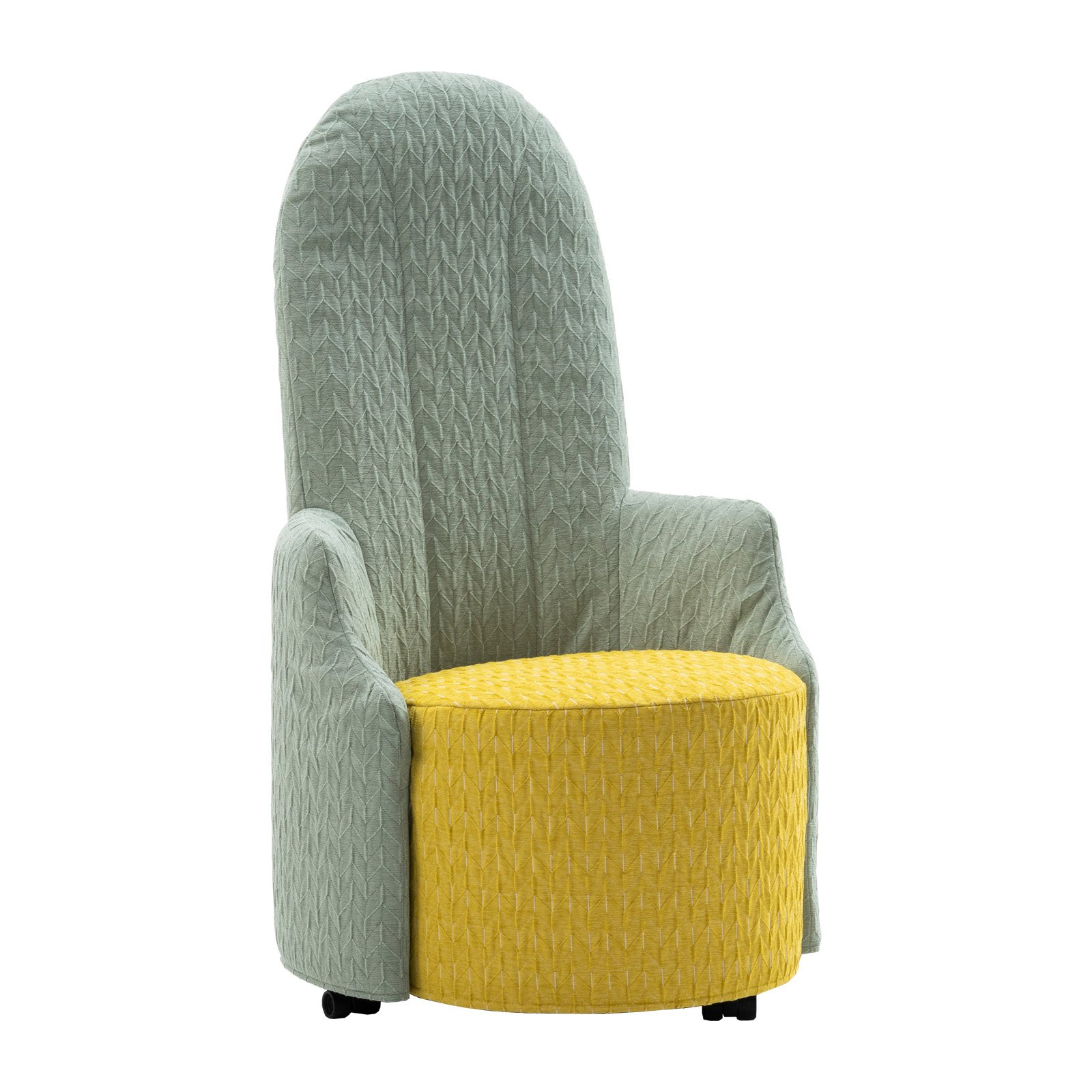 Geschwungene Armlehnen, die hohe, oben gerundete Rückenlehne mit ihren Ziernähten, die geometrische Sitzbasis – der amandine Sessel von Brühl verbindet Anklänge an den Empirestil und den Jugendstil. Wie zwei schützende Hände scheinen sich die Armlehnen um die Sitzbasis zu legen – die zweifarbige Ausführung des Sessels verstärkt diesen Effekt noch. Mit Vergnügen möchte man hier verweilen.